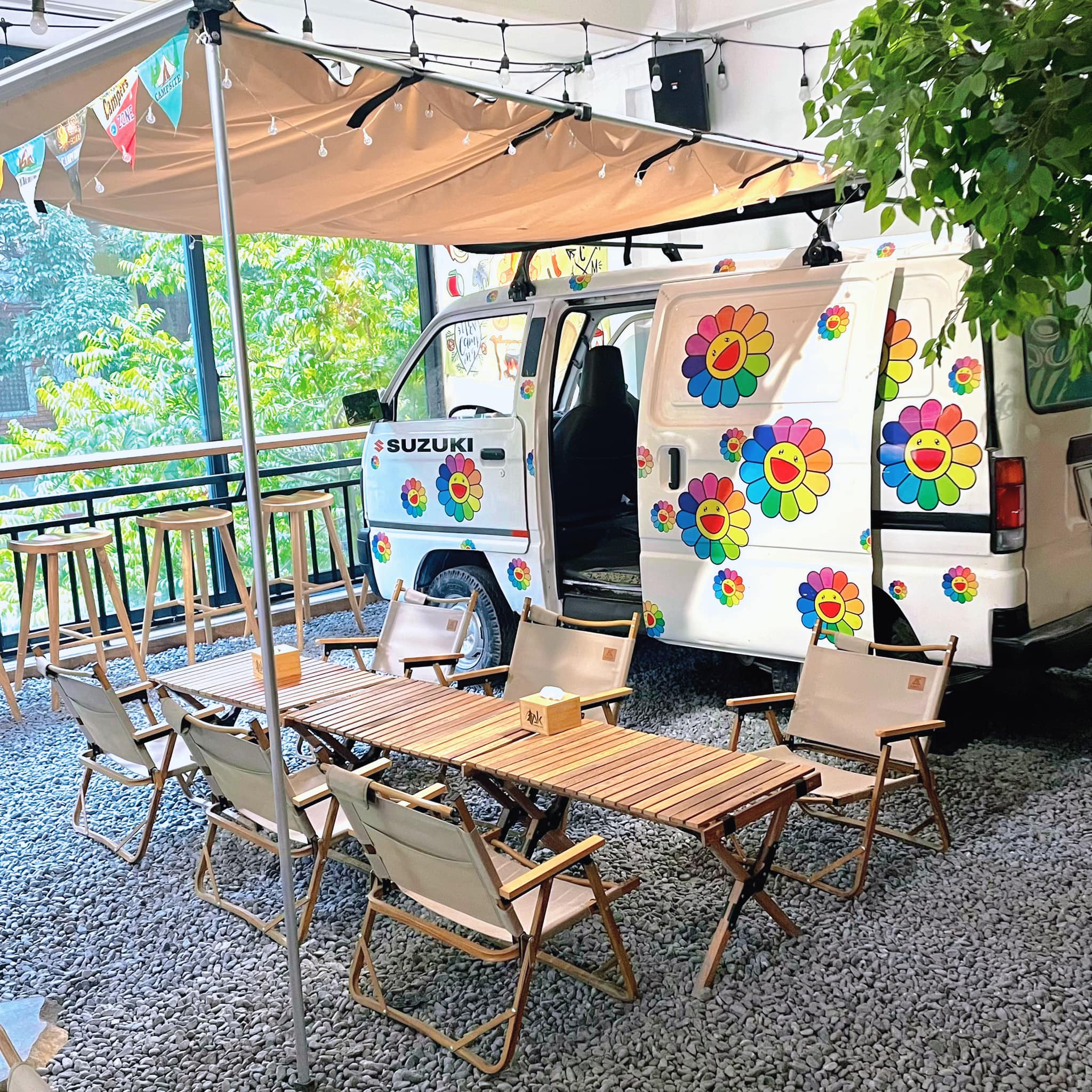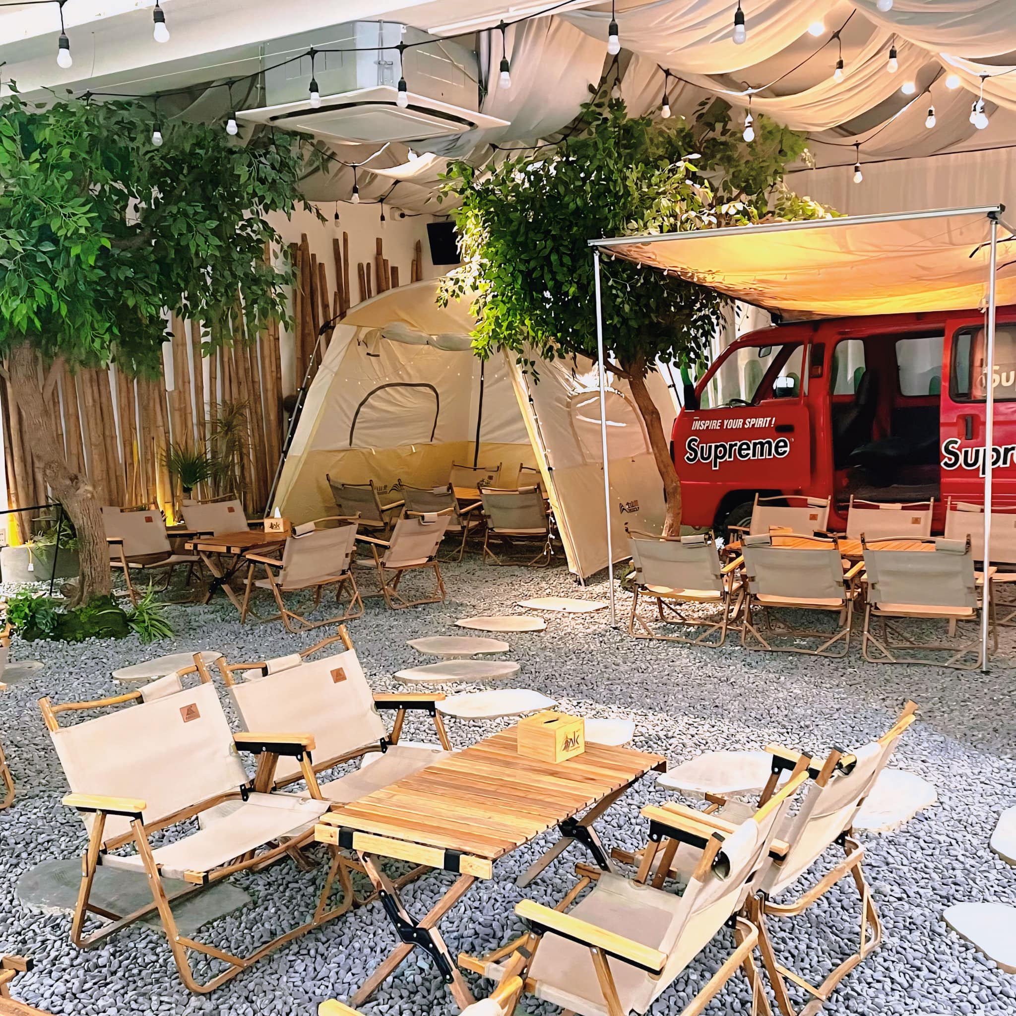 - Không gian được decor theo phong cách dã ngoại: sàn đá sỏi sạch sẽ, bàn ghế gỗ đơn giản và lều trại mini nổi bật giúp khách cảm nhận sự thư giãn, tự do như đang cắm trại thực thụ.
