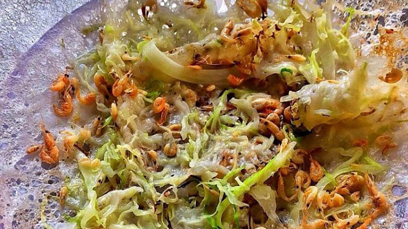 - Bước 3: Tiếp tục cho bột gạo tẻ và phần tép lên mặt trên. Lúc này, đậy vung chảo khoảng 1 phút và có thể lấy bánh ra thưởng thức.