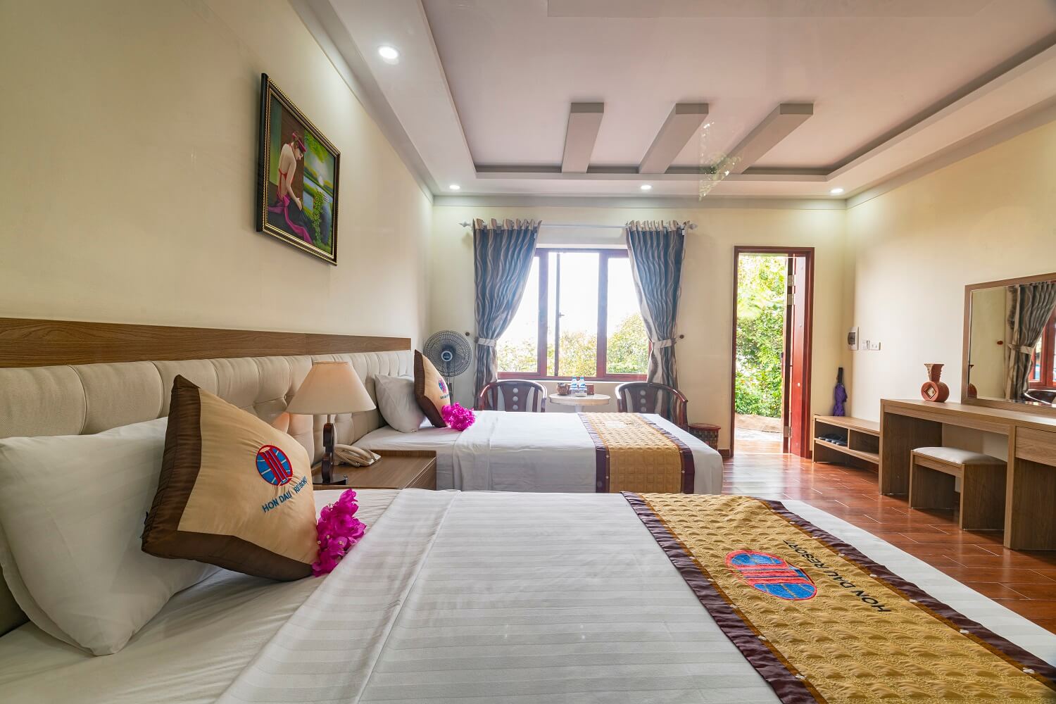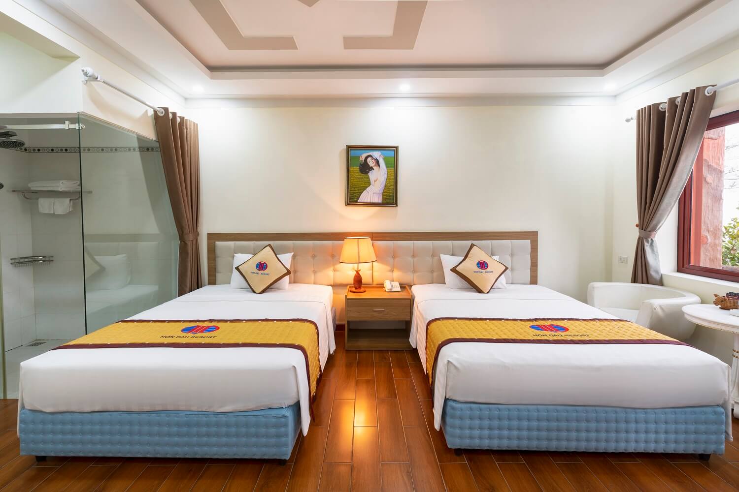 - Loại giường: 2 giường đơn (kích thước mỗi giường 1.4m x 2m), phù hợp cho 2 người lớn và 1 trẻ em dưới 8 tuổi (có phụ thu đối với người lớn thêm).