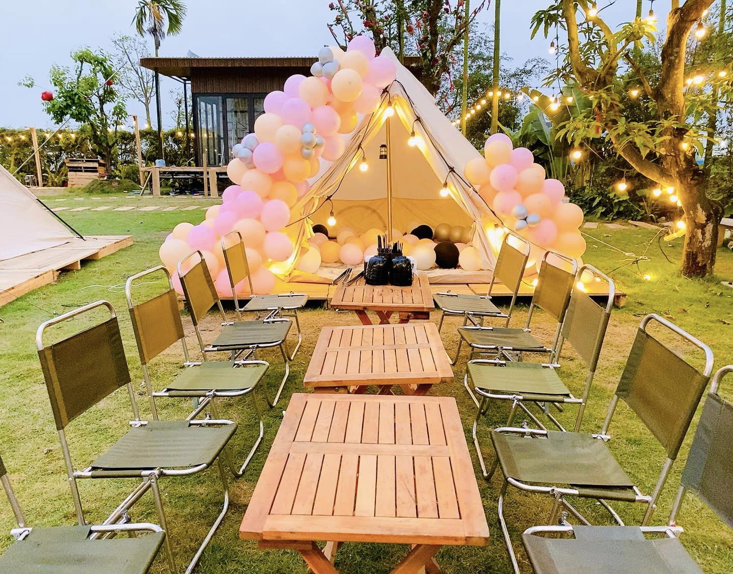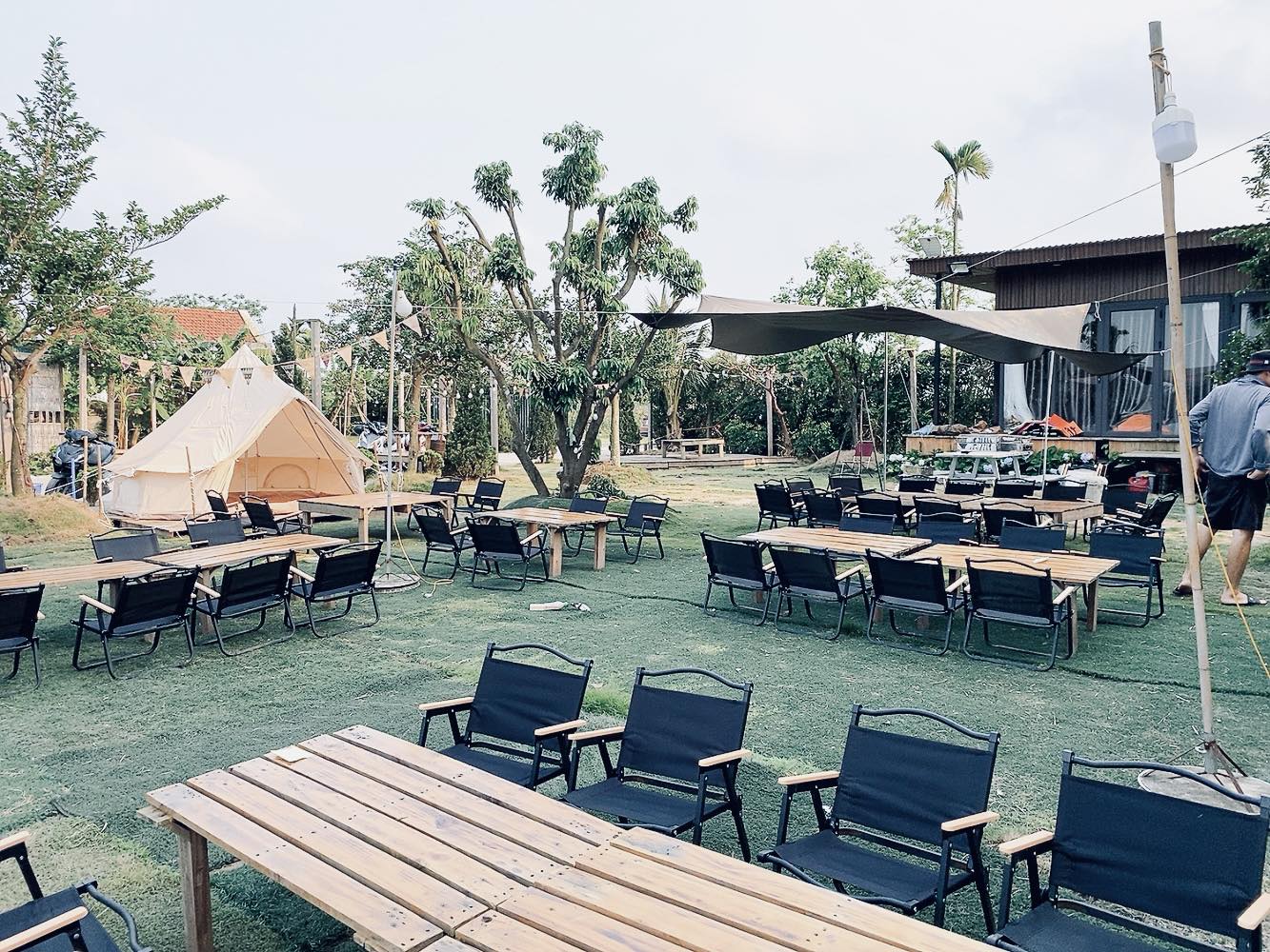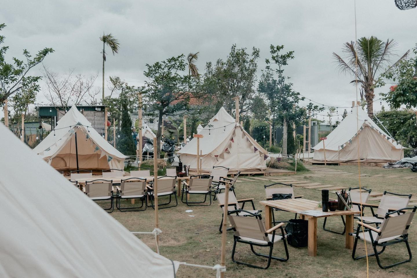 Khu cắm trại bày trí các kiểu lều đa dạng như lều biệt thự, lều thổ dân, lều mông cổ, đều được bảo trì và chuẩn bị sẵn để phục vụ khách. Không gian chung rộng rãi phù hợp cho các hoạt động tập thể như tiệc BBQ, teambuilding, gala, liên hoan hay picnic ngoài trời.
